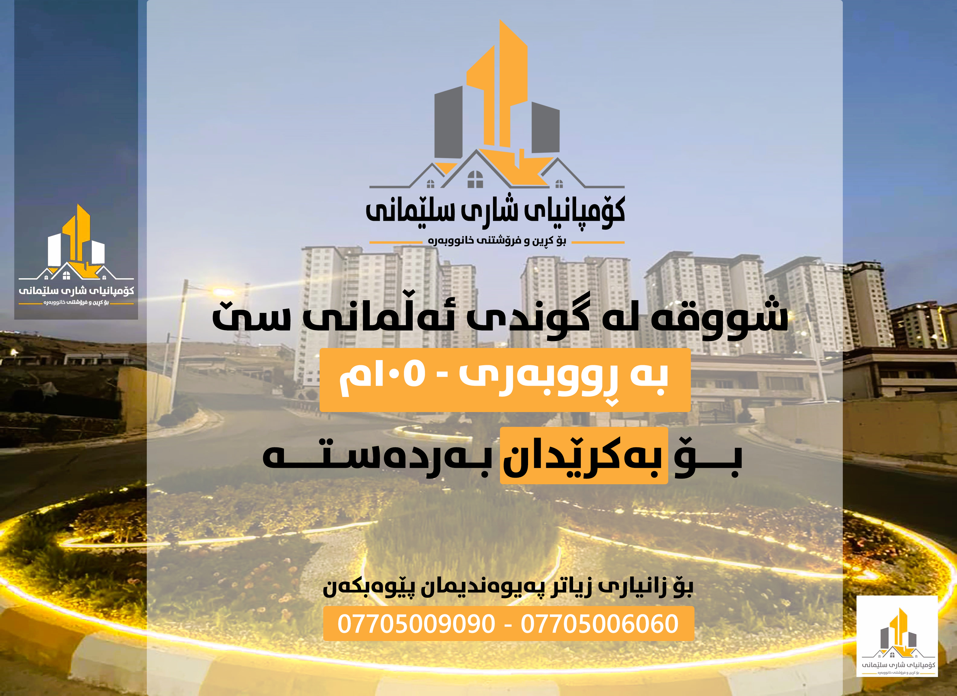 شووقەیەکی ڕاخراو بۆ بەکرێدان لە سلێمانی لە پڕۆژەی گوندی ئەڵمانی سێ بەتەواوی خزمەتگوزارییەکانەوە وەک ( ئاو ، کارەبا ، غاز ، سکیۆرتی ، کامێرای بەردەوام ) ڕووبەری شووقەکە (105) مەترە ( ڕووی سلێمانی )، پێکھاتووە لە : مەدخەل ، ژووری میوان ، چێشتخانە ، دوو ژووری نووستن ، مشتملات ، دوو باڵکۆن . ڕوونکردنەوەی زیاتر : شووقەکە پاکوخاوێنە و باشترين کەرەستەی بیناسازی تیادا بەکارهێنراوە ( سپلێت ، سێتی گەرماوی ، سێتی کەوانتەر ) بەسەرجەم کەلووپەلەکانیەوە بۆ کرێ. بۆ وەرگرتنی نرخ و بینینی ئەم موڵکە سەردانی ئۆفیسی( کۆمپانیای شاری سلێمانی ) بکەن ناونیشان - شەقامی شەست مەتری بەرامبەر گاردن سیتی - شەقامی سالم بەرامبەر باخی گشتی تەلاری قەزاز یان پەیوەندی بکەن بەستافەکانمانەوە 07705008080
