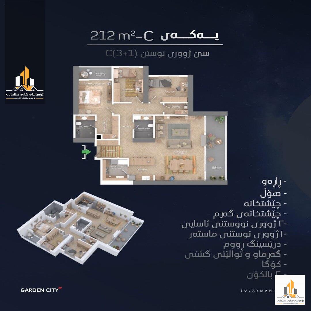 شوقە بۆ فرۆشتن لە سلیمانی لە گاردن ستی تاوەرز بە رووبەری (212)م رووی قیبلە و رۆژهەڵات ، پێک دێت لە ،مەدخەل ،ژووری میوان ،سێ ژووری نوستن ،یەکێکیان ماستەرە، چێشتخانە، یاریدەدەری چێشتخانە ،مشتەمەلات ،بەتەواوی خزمەتگوزارییەکانەوە لە ( ئاو ، کارەبا ، غاز ، سکیۆرتی و کامێرای چاودێری بەردەوام، و چەندین خزمەتگوزاری شاهانە کەلەپڕۆژەی نیشتەجێبوونەکانی تری شاردانیەو تەنها لە گاردن سیتی تاوەرس هەیە ، لەگەل زنجیرەیەک لە بازاڕ و رێستۆرانت . ڕوونکردنەوەی زیاتر: پڕۆژەکە لە کارکردندایە و باشترین کەرەستەی بیناسازی تیادا بەکارهێنراوە هەر باڵەخانەیەک گەراجی داخراوی تیادایە ( سەقفی مەغریبی ، ئەرزی لامینات ، شۆفاش ، بوونی سپلێت لە تەواوی ژوورەکاندا ، گەرماوی تورکی ، سیستەمی غاز ، سیستەمی ئاگرکوژێنەوە ، پەنجەرەی دەبڵ شووشەی ) بۆ وەرگرتنی نرخ و بینینی ئەم موڵکە سەردانی ئۆفیسی( کۆمپانیای شاری سلێمانی ) بکەن ناونیشان شەقامی شەست مەتری بەرامبەر گاردن سیتی یان پەیوەندی بکەن بەستافەکانمان 07705008080