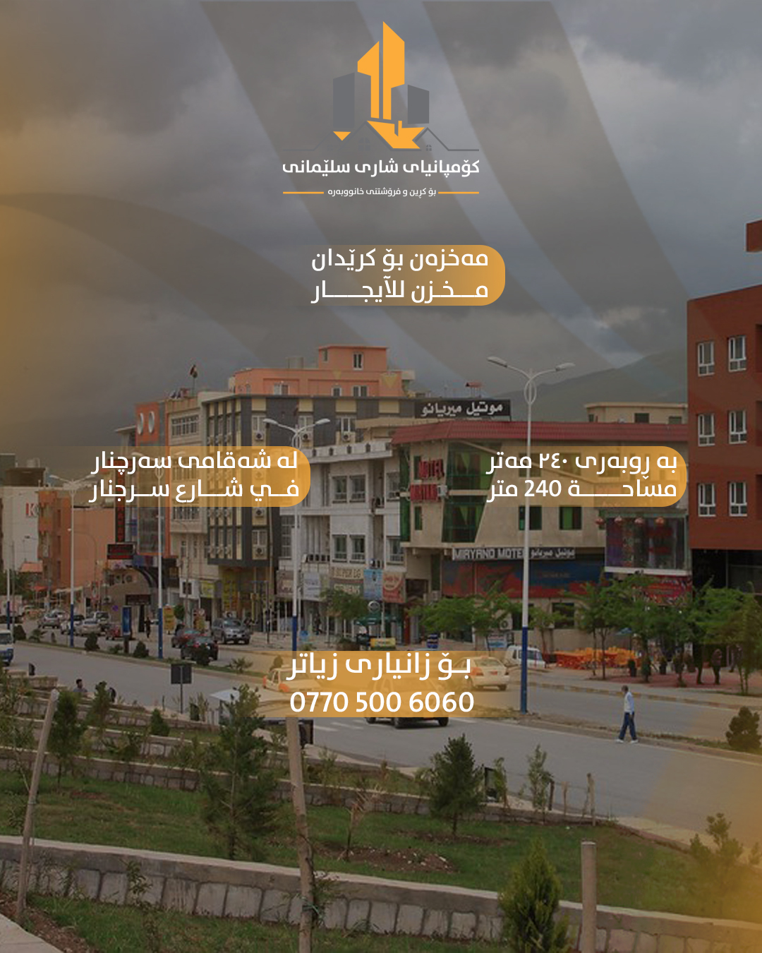 مەغزەن بازرگانی بۆ فرۆشتن لە سلێمانی لە سەرچنار ، بە رووبەری (240)م، رووی ئەزمەر، سیستەمی کامێرای تیایە و مشتەمەلات ، بۆ وەرگرتنی نرخ و بینینی ئەم موڵکە سەردانی ئۆفیسی( کۆمپانیای شاری سلێمانی ) بکەن ناونیشان - شەقامی شەست مەتری بەرامبەر گاردن سیتی یان پەیوەندی بکەن بەستافەکانمان 07705008080-07705002020
