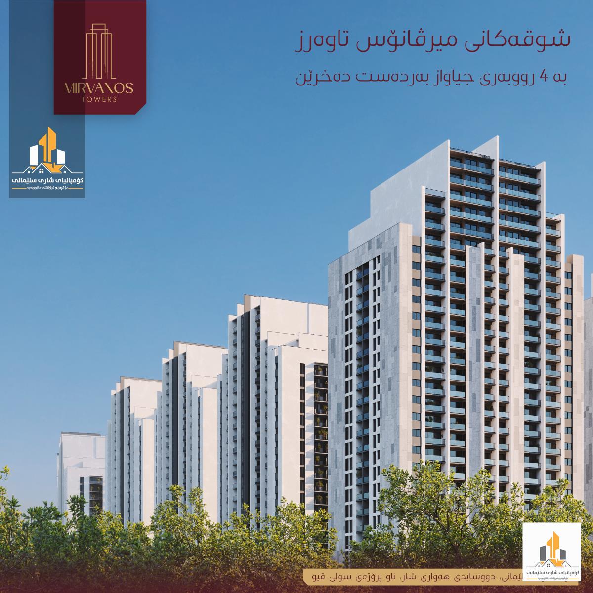 میرڤانۆس تاوەرز پرۆژەیەکی نیشتەجێبوونی مۆدێرنە، دەکەوێتە زۆنی ئاڵتونیی باکوری سلێمانی و راستەوخۆ بەسەر (4000) دۆنم لە سەوزایی پارکی ھەواری شار سلێمانیدا دەڕوانێت، ئێستا تۆ دەتوانیت بە پێشەکیی گونجاو و قیستی درێژخایەن یەکەیەکی نیشتەجێبوون لەم پرۆژە نایابەی شار ھەڵبژێریت. شوقەکانی ئەم پرۆژەیە کوالێتییان بەرزە و تایبەتمەندیی سەرنجراکێشان تێدایە، وەک: • دیوار و درگا و پەنجەرەی عازل بۆ گەرما و سەرما و دەنگ. • زەویی لامینات لە جۆری کوالێتی بەرز. • سەقفی مەغریبی. • کەوانتەری مۆدێرن و کوالێتی بەرز. • پەنجەرەی فراوانی ئەلەمنیۆمی دەبڵ جام • باڵکۆنیی فراوان. شووقەی ڕووبەری (141) مەترە, ڕووی ڕۆژهەڵات و ئەزمەڕ ، بەردەستە بەتەواوی خزمەتگوزاریەکانی لە ( ئاو ، کارەبا ، غاز ،گەراجی دفن، سکیۆرتی و کامێرای چاودێریکردن) کەپێکدێت لە : مەدخەل ، میوان ، چێشتخانە ، سێ ژووری نوستن یەکێکیان ماستەرە ،ژووری خزمەتگۆزار ،دوو مشتەمەلات ،لاوندری هەیە ، نانخواردەن، گەنجینە ، باڵکۆن . بۆ وەرگرتنی نرخ و بینینی ئەم موڵکە سەردانی ئۆفیسی( کۆمپانیای شاری سلێمانی ) بکەن ناونیشان - شەقامی شەست مەتری بەرامبەر گاردن سیتی - یان پەیوەندی بکەن بەستافەکانمانەوە 07705008080