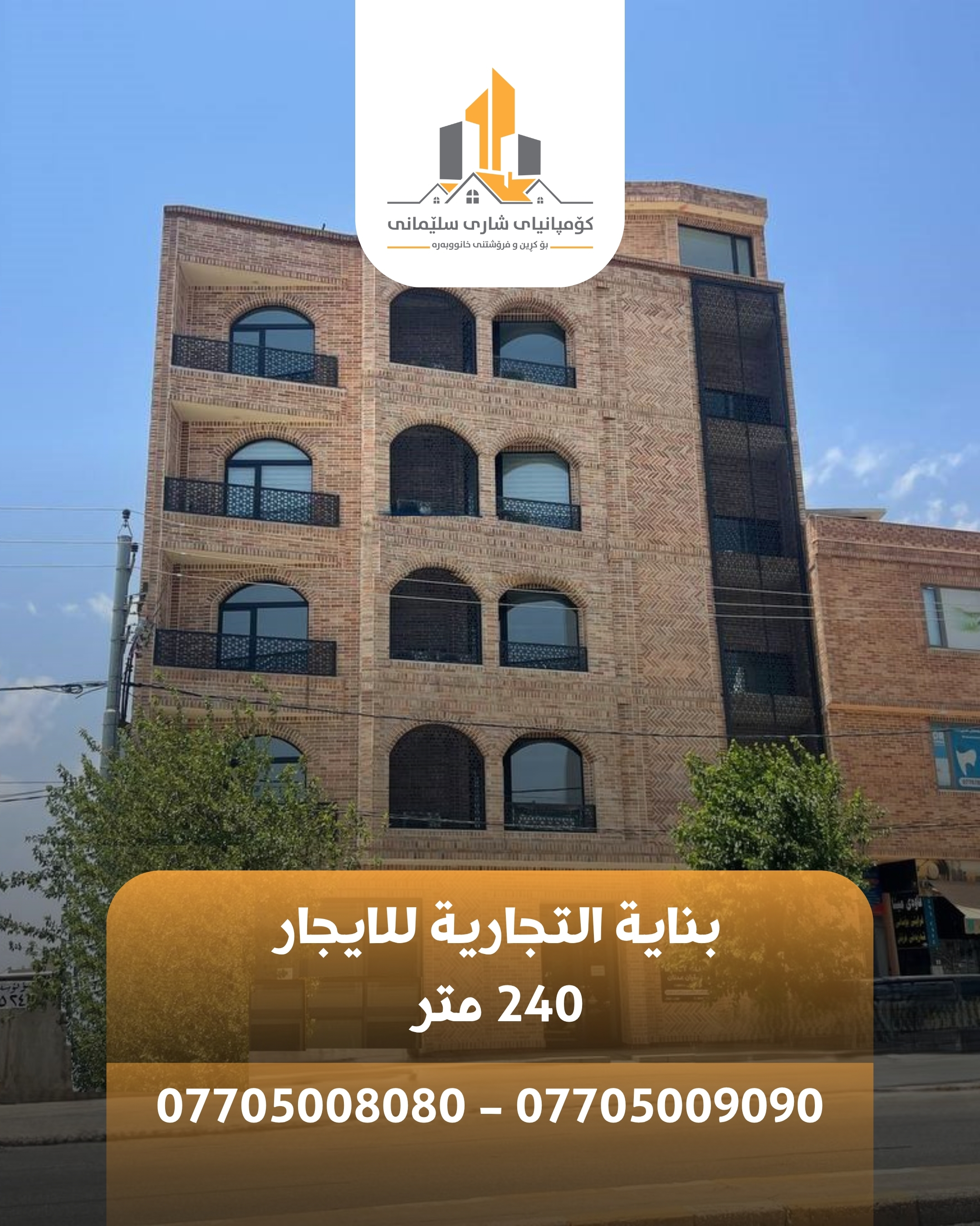تەلارێکی بازرگانی نوێ بۆ بەکرێدان لە سلێمانی شەقامی سەرەکی ئیبراهم پاشا ، دوو ڕووی هەیە ڕووی ڕۆژهەڵات و ڕۆژئاوا ، ڕووبەری (240) مەتر لەسەر شەقامی (40) مەتری ، لە شەش نهۆم پێکهاتووە: #نھۆمی_ئەرزی پێکدێت لە : مەدخەل ، مسعد ، دەرمانخانە ، تاقیگە ، مشتەملات . #نھۆمی_یەکەم تا چوارەم پێکدێت لە : لە هەر نهۆمێک دوو شووقەی تێدایە دوو ژووری و مشتەمەلات ، سەرجەمیان (8) شووقەیە #نھۆمی_ئەرزی پێکدێت لە : دەرمانخانە ، تاقیگە ، مشتەملات ، کراوەیەک ، #نھۆمی_ژێرزەمینی پێکدێت لە : گەراجی داخراو ، گەنجینە ، ژووری میکانیکی ، مشتەملات ، ڕوونکردنەوەی زیاتر لەسەر باڵەخانەکە: باڵەخانەکە مۆڵەتی دەرمانخانەی هەیە ، باڵەخانەکە نوێیە و باشترین کەرەستەی بیناسازی تیادابەکارهاتووە ( مەسعەد ، سەقفی مەغریبی ، کامێرای چاودێری ، تەوزیعاتی ئاگرکوژێنەوە ، پلیکانەی فریاکەوتن ، محاویلە کارەبا تایبەت بەخوی ، دیکۆری دەرەوەی باڵەخانەکە خشت. بۆ وەرگرتنی نرخ و بینینی ئەم موڵکە سەردانی ئۆفیسی( کۆمپانیای شاری سلێمانی ) بکەن ناونیشان شەقامی شەست مەتری بەرامبەر گاردن ستی یان پەیوەندی بکەن بەستافەکانمان 07705008080 07705009090